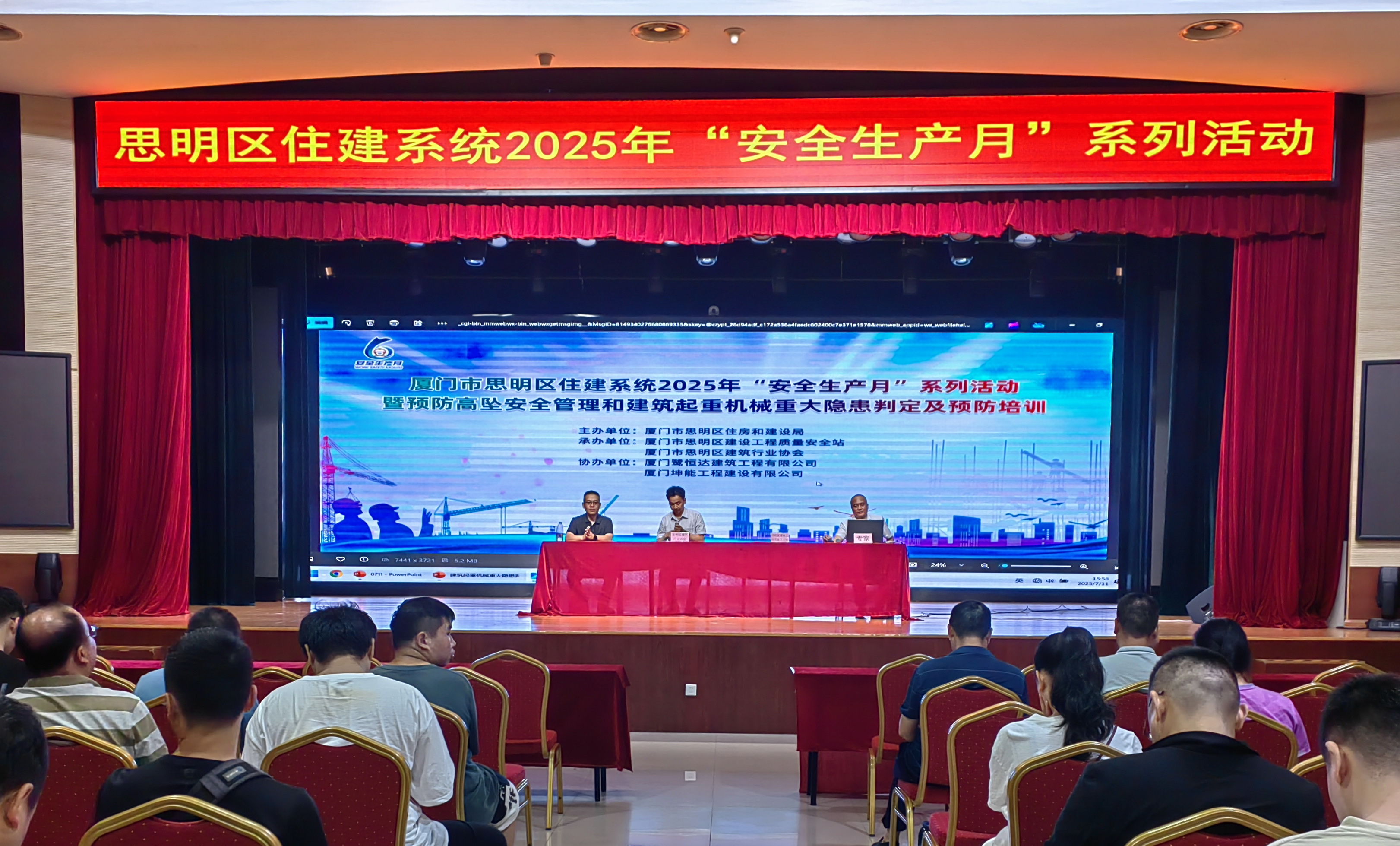 为深入贯彻习近平总书记关于安全生产的重要论述,全面落实国家、省、市对“安全生产月”活动的部署,2025年07月11日下午由厦门市思明区住房和建设局主办,我司协办的厦门市思明区住建系统2025年“安全生产月”系列活动暨预防高坠安全管理和建筑起重机械重大隐患判定及预防培训在厦门市工人文化宫105报告厅圆满举行。